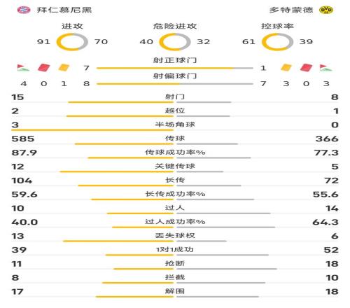 在这场比赛里,拜仁在射门方面以15-8明显占优;其中在射正方面,拜仁更是以7-1遥遥领先。在控球率方面,拜仁也以61-39%明显占优。在传球方面,拜仁以585-366远远高出对手;在传球成功率方面,拜仁以87.9%-77.3%同样占优;其中在关键传球方面,拜仁也以12-5明显高出对手。在过人方面,多特以14-10领先;过人成功率方面,多特也以64.3%-40%占据着上风。
